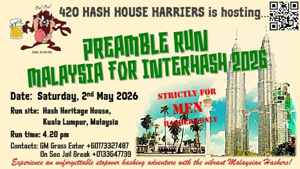 420 Hash House Harriers a male only Chapter invites and welcomes hashers around the world to a Preamble Run in Kuala Lumpur, Malaysia.