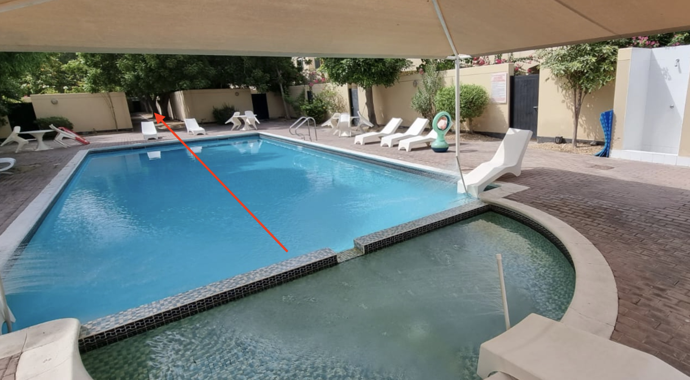 To enter the communal pool area, use the black gate on the left, at the side of the compound. See pictures below.