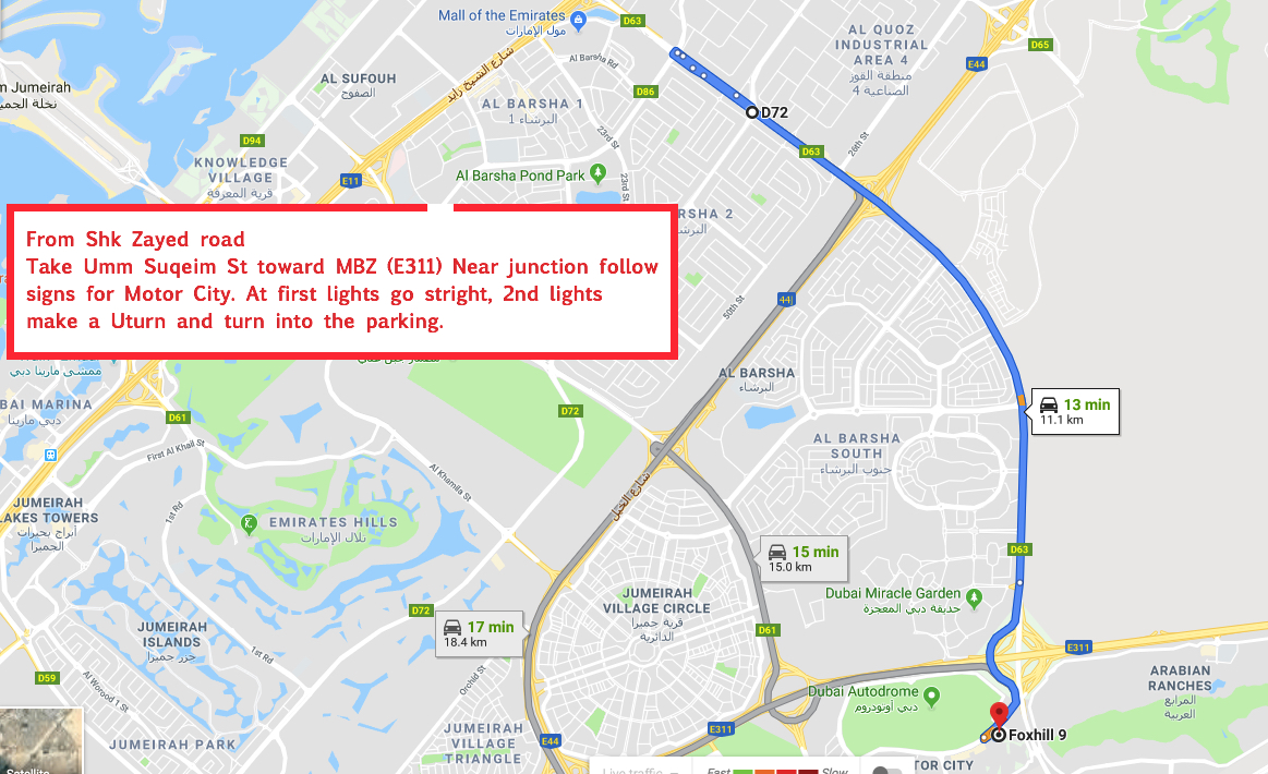 Direction: From Sheikh Zayed Road, take Umm Suquiem Street towards Mohamed Bin Zayed Road (E311,) go over the junction and follow signs for Motor City. At the first set of traffic lights go straight, at the 2nd set make a U-turn and drive into the parking area.