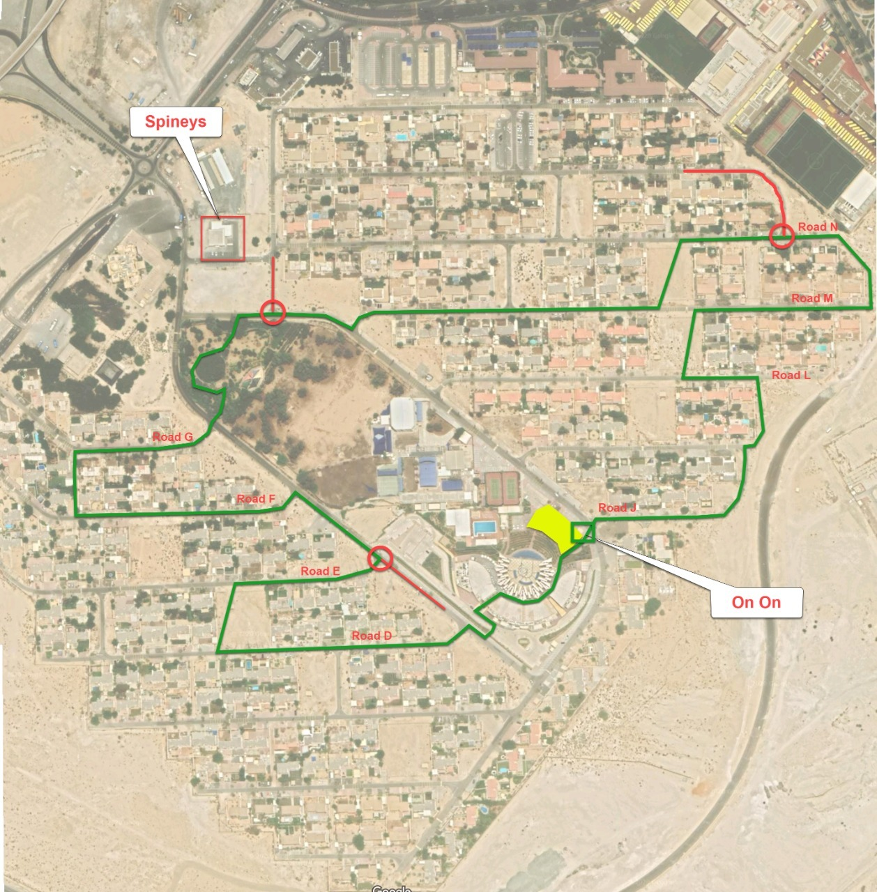 Start from the main car park at Jebal Ali Club (The side nearest C House Milano, shown in yellow on the map)